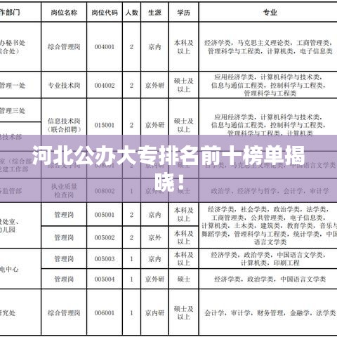 河北省作为教育大省,拥有众多高等教育机构,其中包括一些优秀的公办大专院校,以下是河北省公办大专排名前十名,这些学校以其优质的教学和科研水平,为社会培养了大量高素质人才。